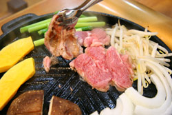 ラム肉を載せる。肉汁が出るまで片面を焼いていきます。